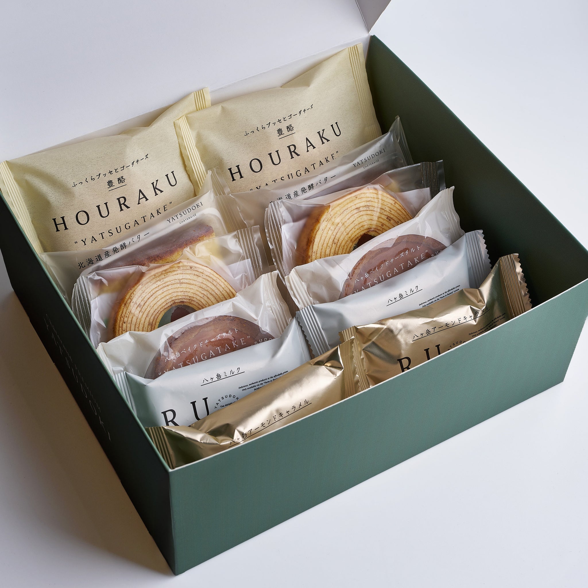 2 pieces each of Houraku, Butter Castella, Mini Baum, Cheese tart, Milk Rusk and Almond Rusk.
